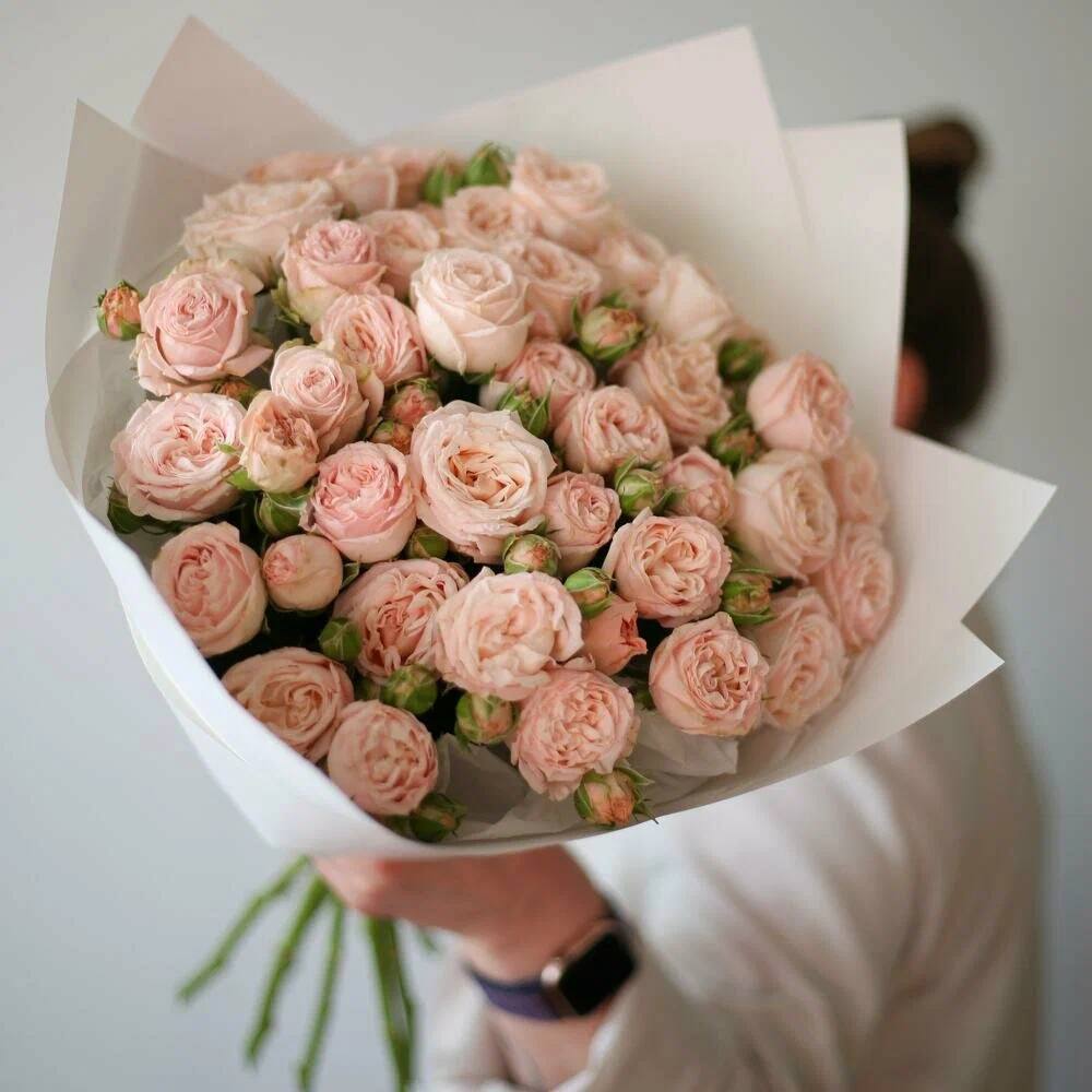 Компактный букет из 9 веток кремовой кустовой розы Бомбастик. Пышно и нежно — отличный подарок с доставкой по Ростову.