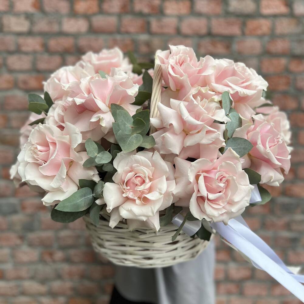 Элегантная плетёная корзина с розами Пинк Мондиаль нежно-розового оттенка. Готовый подарок: не нужна ваза, цветы уже в подарочном виде. Идеально на 8 марта, день рождения или юбилей.