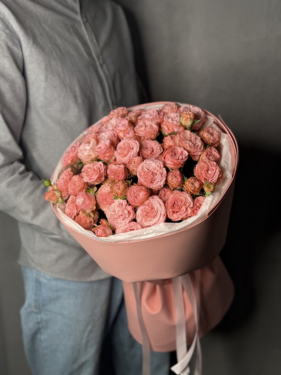 Пышный букет из 15 веток кремово-белой кустовой розы Бомбастик. Объёмная и нежная композиция для особенного человека. Доставка свежих цветов по Ростову.