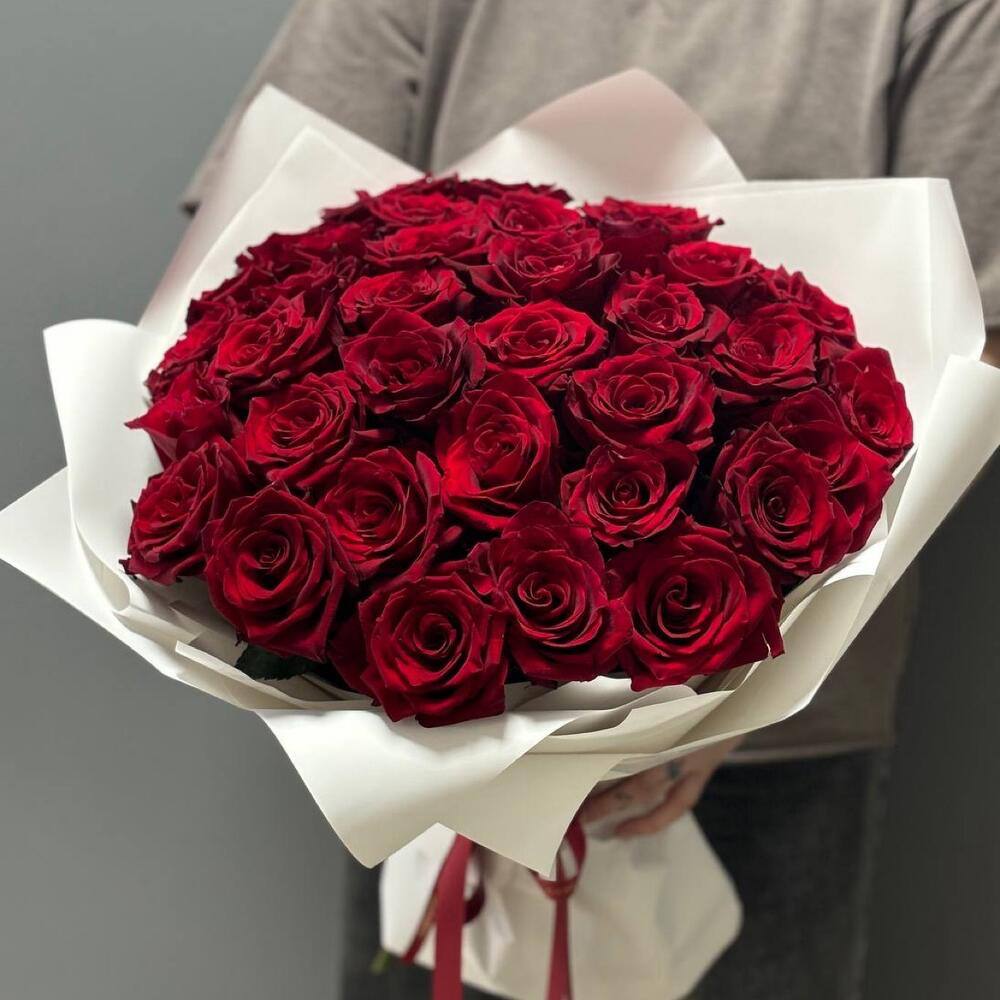 Объёмный букет из 35 бордовых роз Эксплорер. Голландское качество, доставка по Ростову.